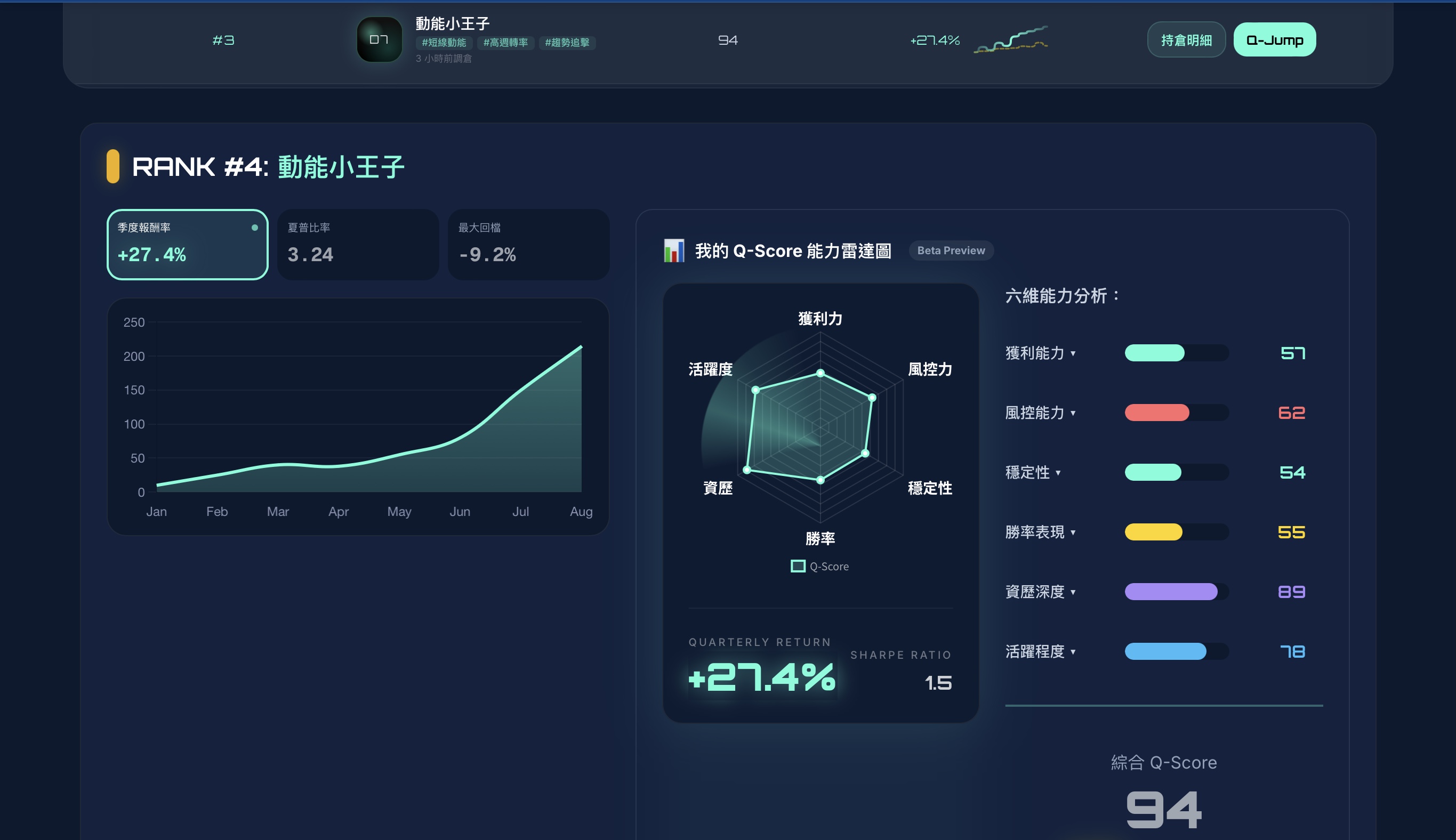 季度收益率 +27.4%,夏普分佈 3.24,最大回檔 -9.2%。六維度分佈:獲利能力 57、風控能力 62、穩定性 54、勝率表現 55、資歷深度 89、活躍程度 78,綜合 Q 值 94。