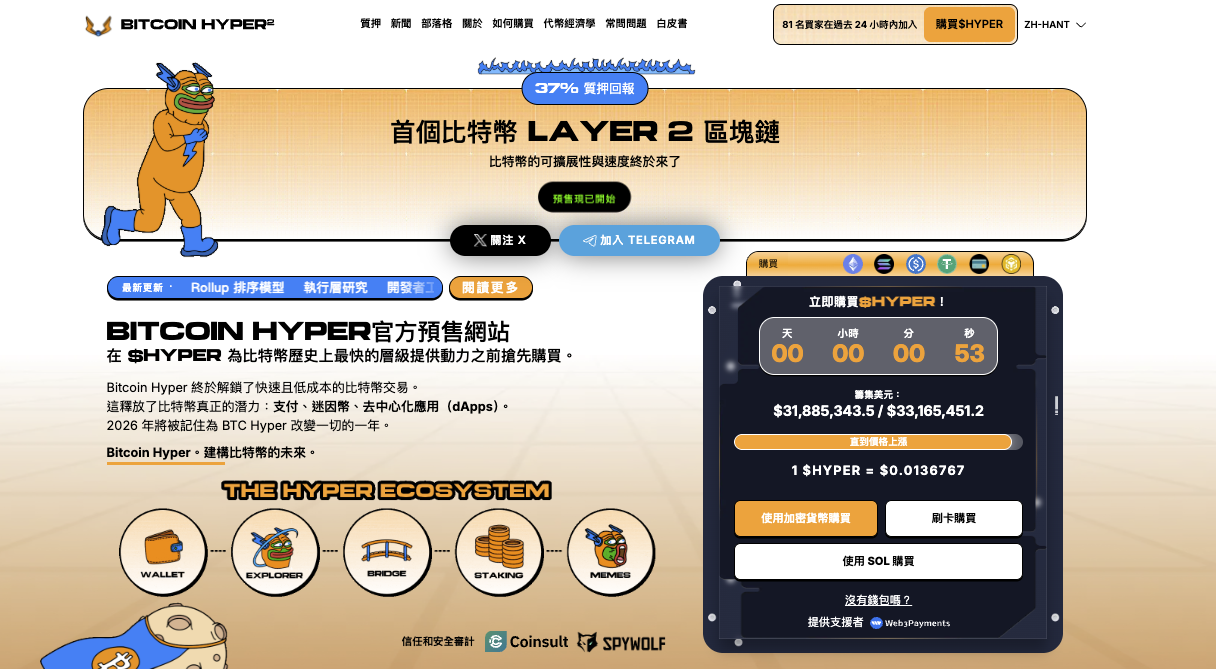其敘事核心對準比特幣長期痛點。比特幣多年以價值儲存為主,交易速度、擴展能力與可編程性受限,導致許多應用需求外溢到其他鏈。Bitcoin Hyper以比特幣Layer2定位切入,並主打採用Solana虛擬機架構,試圖把BTC的安全性與SVM的高速效能結合,讓比特幣能在DeFi、遊戲、支付、智能合約與模因資產等領域更容易落地。