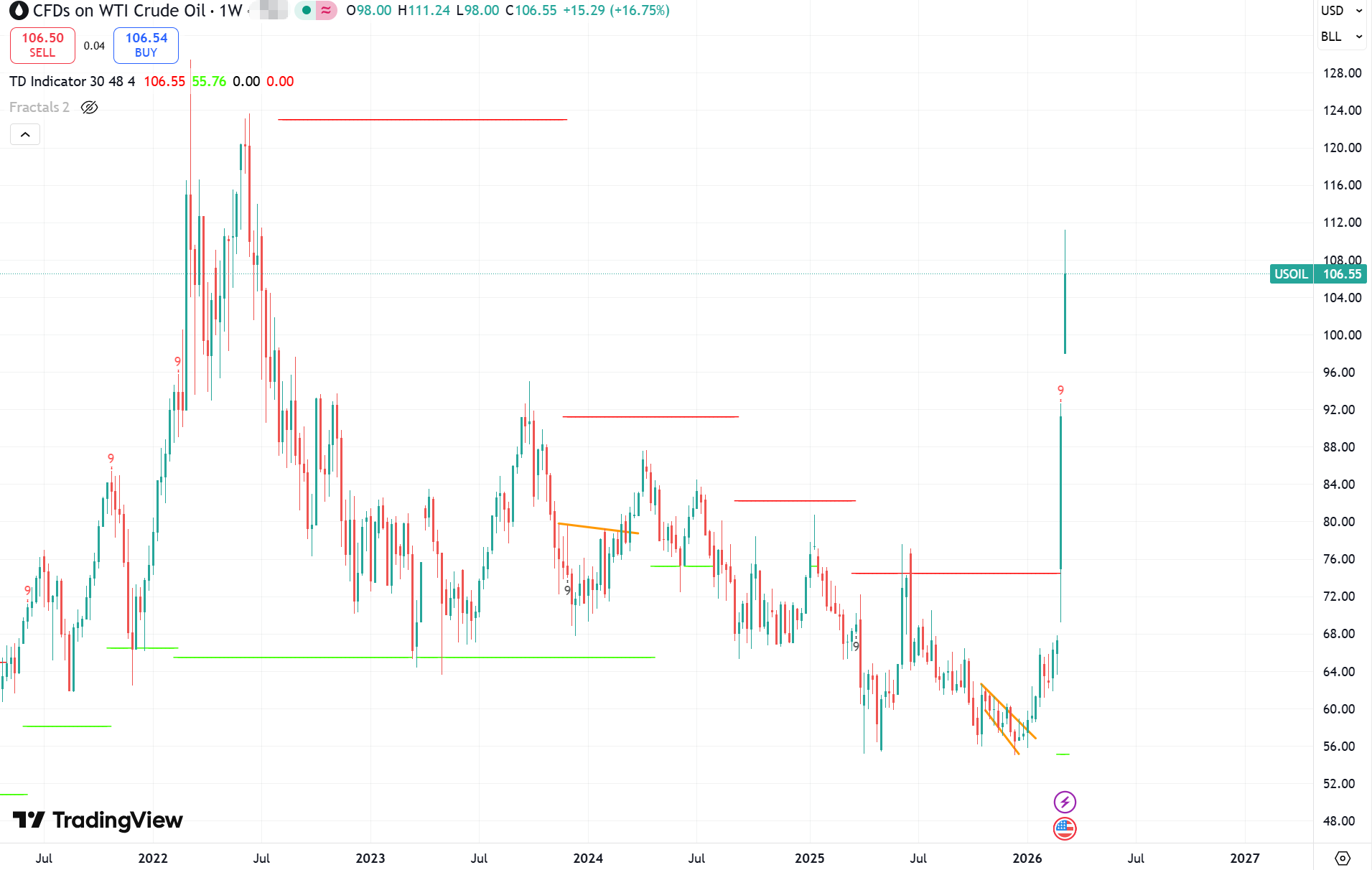 美油本週一重複上週行方請,再次出現跳空高開走勢,並且順勢突破100美元大關。這是拜登政府之後,油價首次出現破百行情,這意味著美國對於油價的管控已經有失效的跡象。技術面的阻力無法阻擋行情的上行也宣布消息面將繼續主導價格波動。可以預見的是,如果本週無法有效回落的話,油價恐怕將繼續向130的高點運行,突破之後則會打開更大的上漲空間。與之對應的則會是更大的戰爭風險和金融體系崩潰。 91附近的跳空缺口將是回落支撐,不過只有戰爭警報徹底解除,油價才有真正回落的壓力。