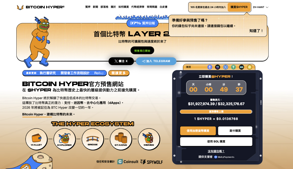 若說衍生品市場反映的是短線風險偏好,那麼預售市場更像是在押注中期敘事與技術路線。Bitcoin Hyper($HYPER)近期預售募資規模達3192萬美元,代幣價格來到0.0136768美元的新階段,調價倒數剩下1天6小時。過去24小時新增106位買家,顯示即使在行情震盪的背景下,仍有資金願意進入具話題度與節奏安排的專案。另有單一鯨魚投入31萬美元的訊息,進一步推升熱度,也讓市場把目光集中在比特幣Layer2的想像空間。