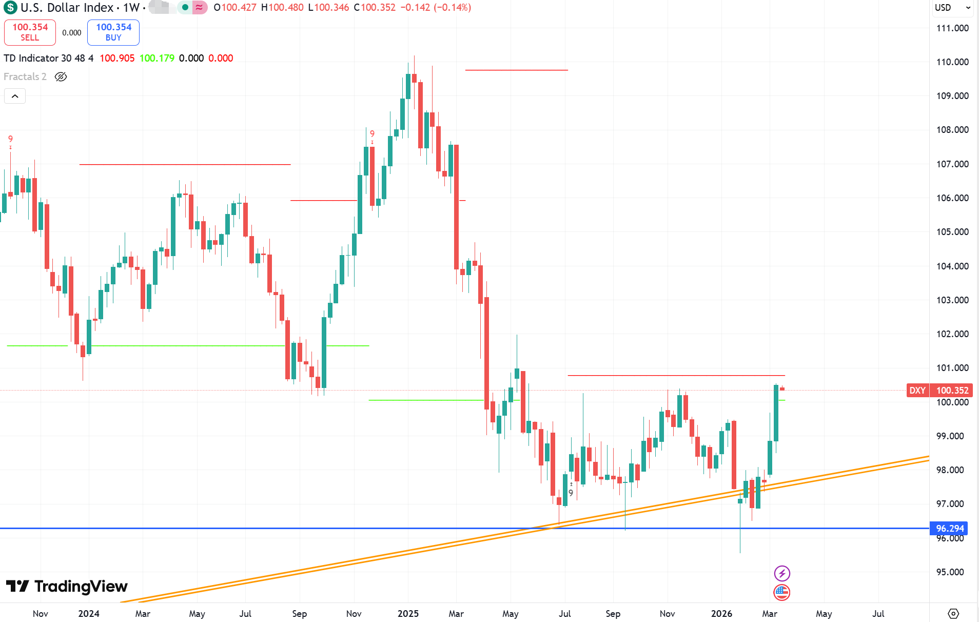 美油上週寬幅震盪,最高觸及119美元,最低則見於76美元,主要是受到伊朗局勢所帶來的消息面影響。週線層級出現大十字星通常暗示需要一定的時間整固和修復之後市場才會進入到新一階段的趨勢,因此前述的價格區間預計將在短期維持住。很明顯,戰事終結將推低油價,而進一步的擴大則會加劇油價漲勢。目前這兩種風險都有限,但持續維持在80美元之上將在中長期影響通膨,並最終傳導到整個金融市場。高油價時間越久,後續市場的整體壓力就越大。