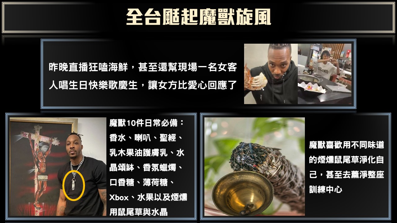 他說只要出戰客場或是到新的球場,甚至是回到家時,他都會用不同味道的煙燻鼠尾草,淨化自己。當時回到湖人隊時,在經過球隊允許後,也點了鼠尾草去薰淨整座訓練中心,包括保全辦公室、湖人隊上的每一位員工,不管是業務內勤的還是球隊外勤的,他一個都不放過,苦笑說「花了我整整3個小時,還薰到煙霧探知器好像也有響」。霍華德說自己非常迷戀水晶,而片中他介紹的是超巨「玫瑰石英」水晶柱,粉色代表愛與慷慨的付出;霍華德也表示他會帶著幾顆不同的水晶放在休息室的櫃子裡,「我還有個水晶滾棒,拿來滾我的球衣或直接滾我的皮膚」會讓他感覺充滿能量以及滿滿的愛。