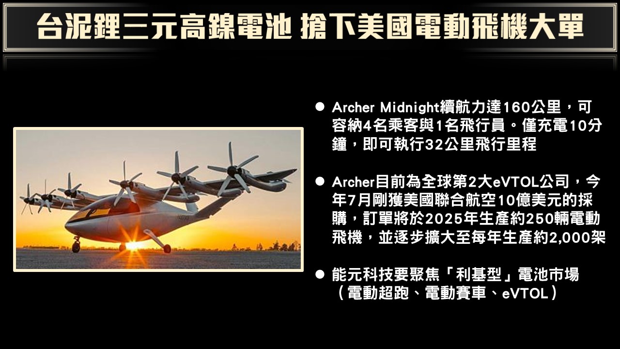 台泥電池事業迎來新客戶,台泥旗下鋰電池製造商能元科技與美國航空公司Archer Aviation共同宣布,Archer旗下最新款電動垂直起降飛行器(eVTOL)Midnight,將採用能元科技位於高雄小港新廠所生產的21700鋰三元高鎳電池,這也是台泥繼英國eVTOL新創Vertical Aerospace後,第2家eVTOL訂單。eVTOL能像飛機一樣水平飛行,但可以垂直起降、無須跑道;能像直升機一樣滯空飛行,但飛行時接近靜音,且配備更多旋翼和應急系統,所以更安全。電動飛行器能夠載人直接從城市中心起降,開闢新形態空中交通方式。
