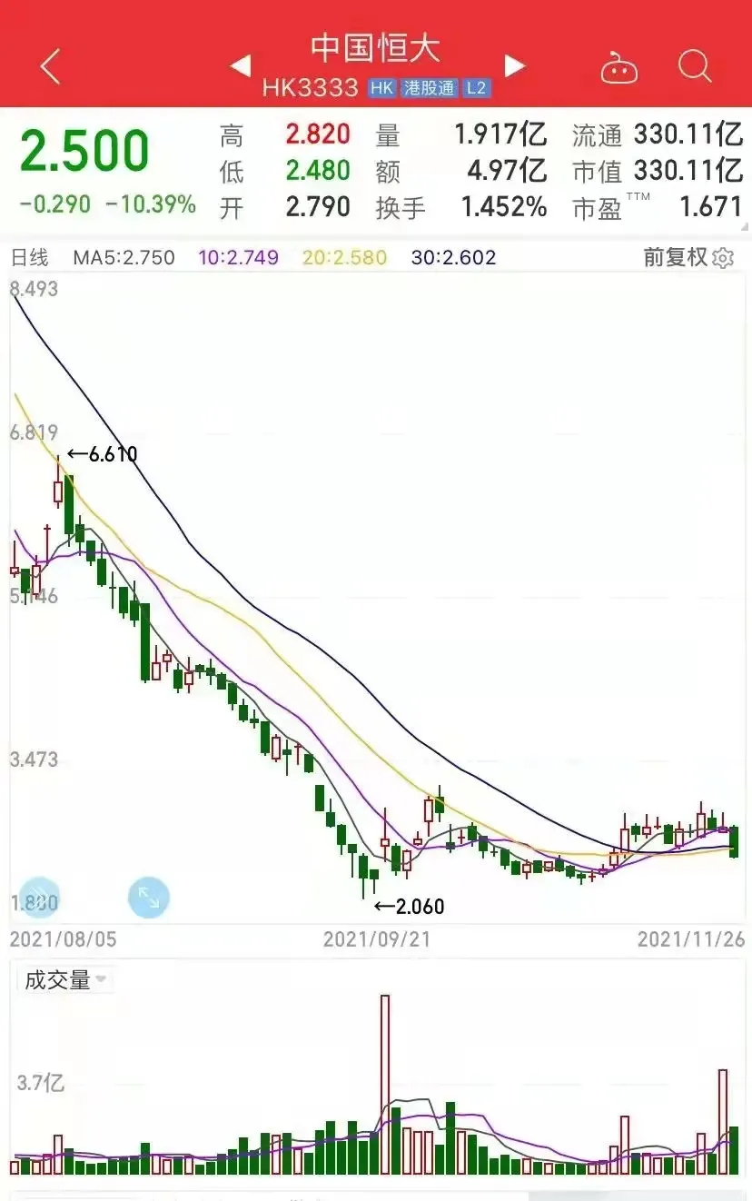股價方面,截至11月26日收盤,中國恆大收報2.5港元/股,下跌10.39%,總市值為330億港元。