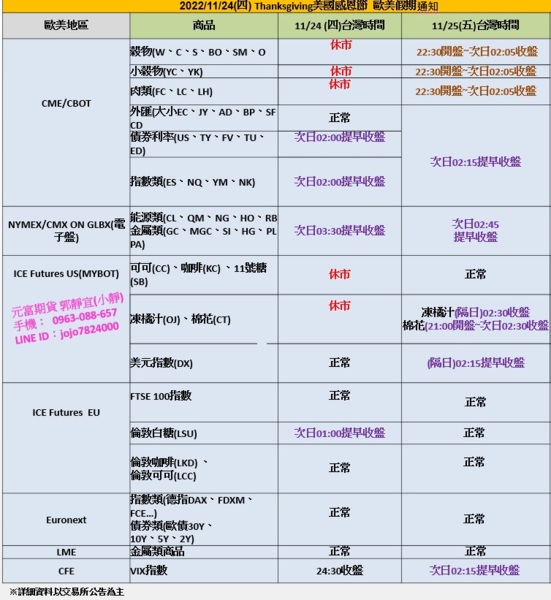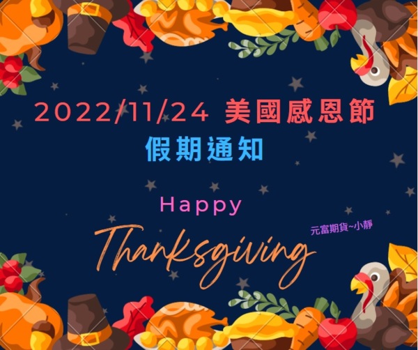 海期快訊【2022年11/24(四) 、11/25(五)美國感恩節Thanksgiving 提早收盤、休市通知】@微道瓊@微標普@微小那@微型輕原油@微黃金@美元指數@黃豆@可可】