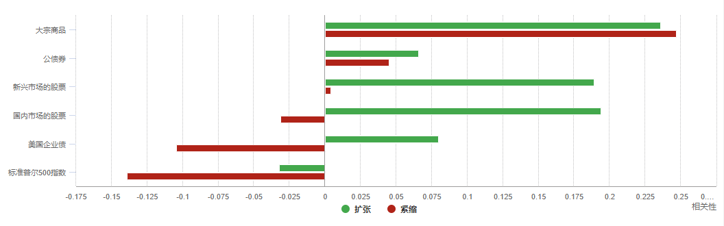 在美國經濟擴張和緊縮期間,黃金與主要金融資產的相關性: