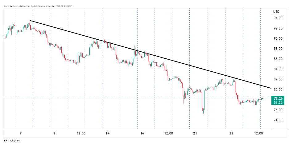 週五(11月25日),國際油價上漲,儘管感恩節假期市場流動性稀薄,但西方各國針對俄羅斯石油價格上限爭論不休,供應端不確定性支撐了油市。美國WTI油價週五自低位77.75美元反彈,上漲約0.45%,目前觸及高位79.28美元。
