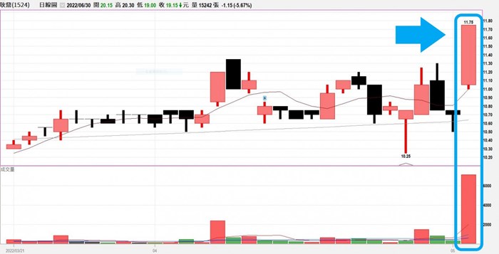 以耿鼎當日成交量5成以上買進價位為11.75元(下圖圈出之大量區),另外有8%的股民是以11.7元買進(下圖低點價位),「隔日開盤若跌破11.75元,代表有6成以上的人通通賠錢,若沒跌破就是代表都賺錢,可以跟著買進」蔣明誠先生肯定地說。