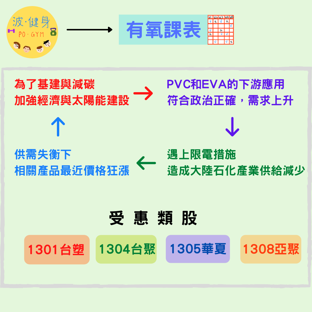 因著基建與太陽能建設,加上下游應用,在限電政策下,石化產業供給減少,帶動了相關價格上揚,也因此帶動起塑化類股。