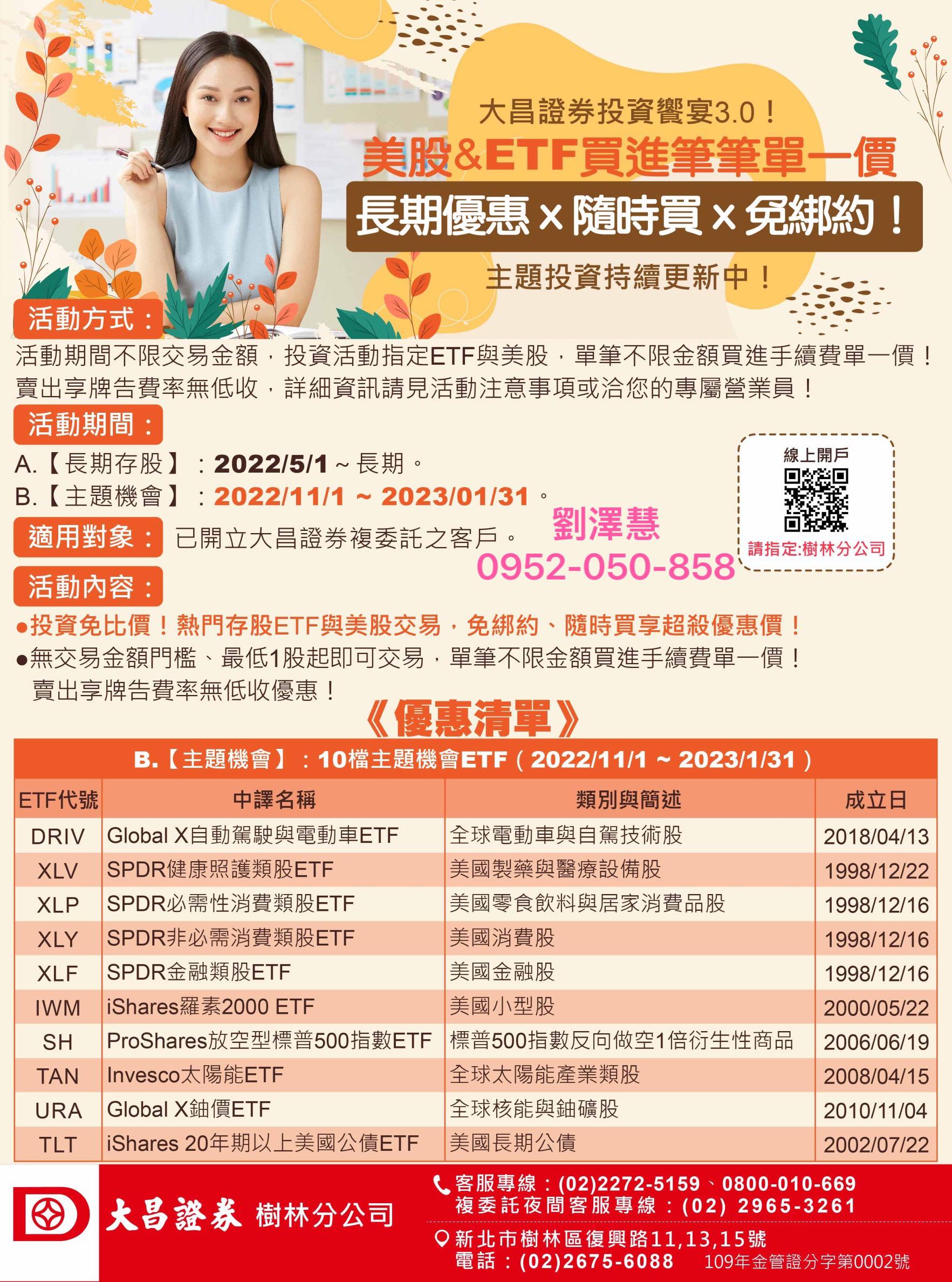B.【主題機會】10檔美股&10檔ETF:活動期間:2022/11/1 ~ 2023/1/31。