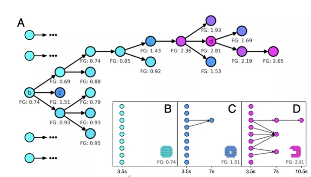 研究人員使用一種進化演算法,從隨機群開始,進化出具有增加自我複製能力的細胞群。 ( FG = 給定群體實現的子代數。 小數部分表示群體距離實現另一輪複製的距離。 )