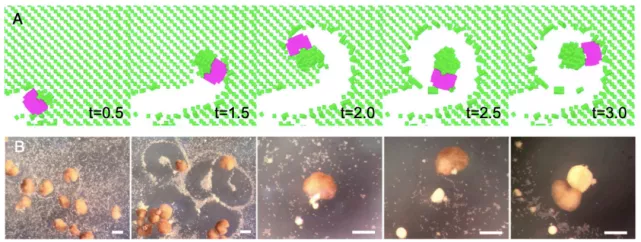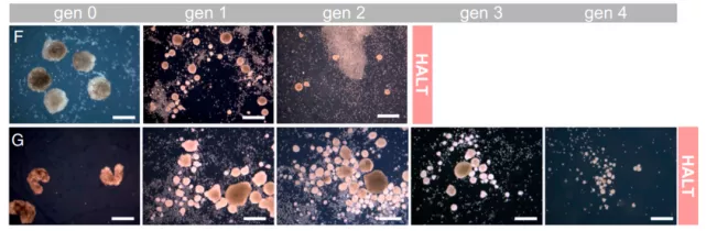 不過,這個複製過程最多持續兩輪。 是否會停止取決於適合青蛙胚胎發育的溫度範圍、解離細胞的濃度、成熟生物的數量和隨機行為、溶液的粘度、培養皿的幾何形狀表面,以及污染的可能性。
