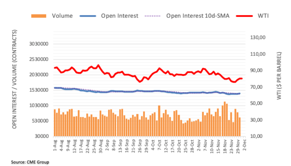 WTI原油價格錄得本周首日下跌,多頭在週四早些時候刷新本周高點後回落至80.4美元/桶附近。隔夜數據線顯示EIA原油庫存錄得2019年以來最大降幅,市場對亞洲疫情擔憂情緒降溫,油價初步頂破了80整數關口阻力,短線看漲信號有所增強。雖然美國原油產量創疫情以來新高,令多頭略微有所顧忌,但美聯儲鮑威爾關於將放緩加息步伐的言論,改善了市場風險偏好,全球股市普遍上漲,短線油價有望震盪上行。
