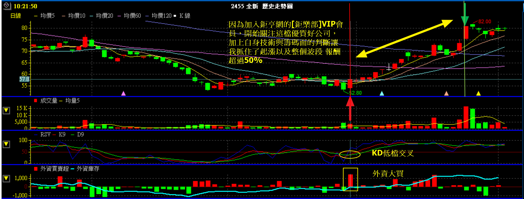 因為加入鉅亨網的[鉅樂部]VIP會員,開始關注這檔優質好公司,加上自身技術與籌碼面的判斷讓我抓到了起漲點及整個波段 報酬超過50%