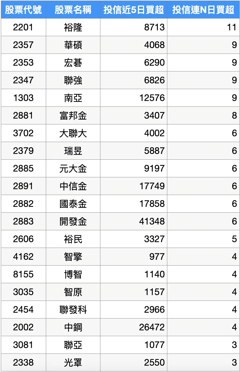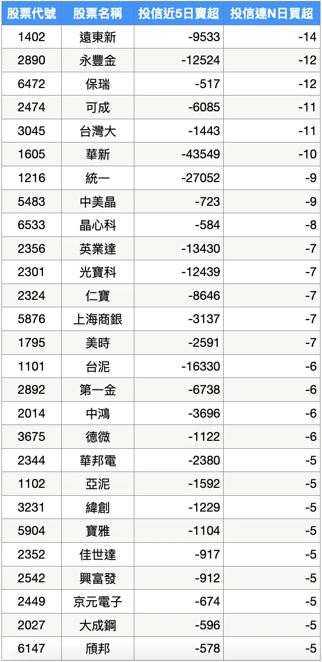 由以上二張圖表可以得知,投信真的在換股。因此,我們今天立馬來幫大家來看看,投信法人在過去一週,到底換了哪一些股票出去,又逢低佈局了什麼股票回來。請先看附表一。