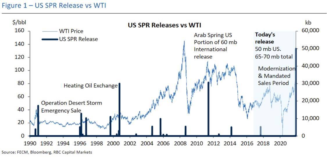 週二 白宮發表聲明,為降低全球通膨、打擊供給短缺,聯合中國、印度、日本、南韓、英國釋出戰備儲油 Strategic Petroleum Reserve,美國目前戰備儲油有 6.06 億桶將釋出 5 千萬桶,但美國每日消耗就達 2 千萬桶,當天西德州原油期貨反而大漲 2.63%、能源 ETF XLF、Chevron、Exxon Mobil 等石油公司股價也都大漲,歷史數據顯示釋出戰備儲油對油價並無明顯影響,關鍵還是原油的供需關係 (下圖)