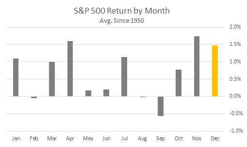 歷史數據顯示 S&P 500 指數自 1950 年迄今,12 月的平均報酬率接近 1.5% (下圖),新的變種病毒、聯準會的縮減 QE 讓今年增添了許多不確定性