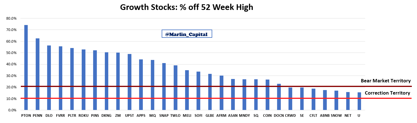 週一 科技成長股普遍下挫,Cloudflare -11.65%、Snowflake -9.23%、Square -6.14%、Palantir -3.55%、Sea -3.5%、nVidia -3.12%,眾多科技成長股股價較 52 週高點已跌落超過 20% (下圖)