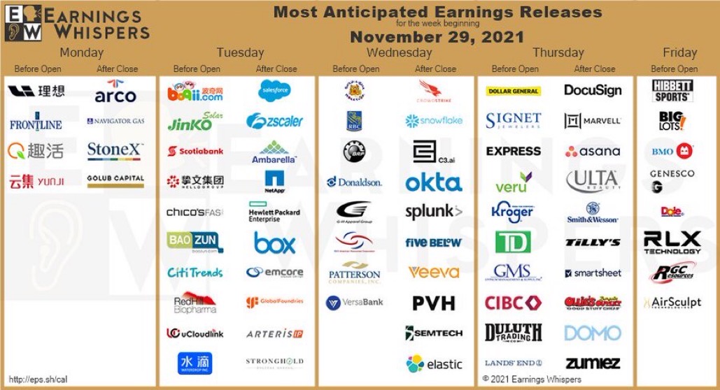 下週較知名的科技公司有 Salesforce、Zscalar、Hewlett Packard Enterprise、Crowdstrike、Snowflake、C3.ai、Okta、Splunk,半導體的 Ambarella、Marvell、Global Foundry (未在圖中),中概股的理想汽車等