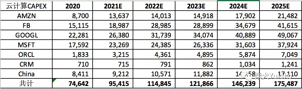 數據中心的業務基本都是2B,輝達數據中心的一部分收入可以看作是雲計算公司的CAPEX,國際上幾家大的分別是Amazon、Microsoft、Google、Facebook、Oracle、Salesforce以及中國的幾家大廠,2020年全球雲計算的資本開始大約在750億美金,輝達拿了其中的50.4億,佔比6.7%, 過去7年之間每年提升1個百分點,預計到2025年,全球雲計算行業和其資本開支的增速在20%+,那麼到2025年雲計算的資本開支可以去到1750億左右,輝達佔比15%則可以帶來260億的收入。