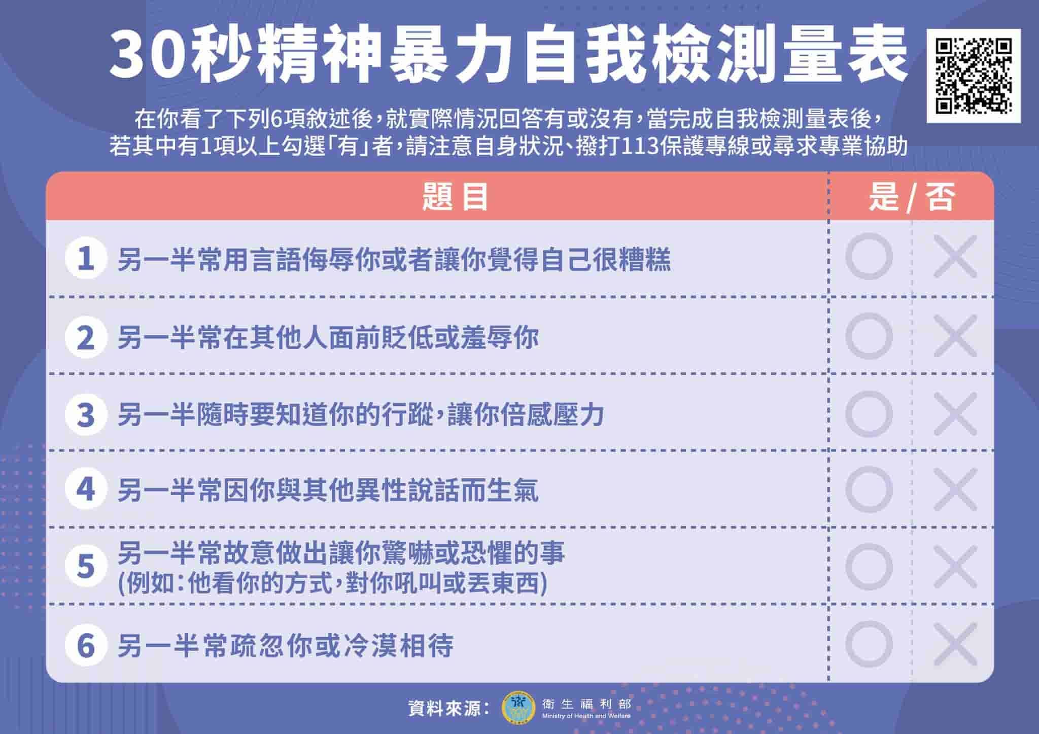 衛福部保護服務司也提供了「簡易精神暴力檢測量表」供民眾參考,只要其中有1項以上為「有」,即應向伴侶溝通,調整互動方式。若有必要,也可撥打113保護專線,或向專業諮詢尋求協助。