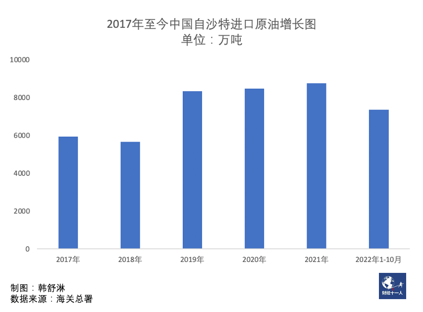 海關總署數據顯示,2022年1月至10月,中國與沙特今年1月至10月進出口總額以美元計價達到972.6億美元,同比增長37.4%。其中自沙特進口665.9億美元,同比增長45%,對沙特出口306.8億元美元,同比增長23.3%。