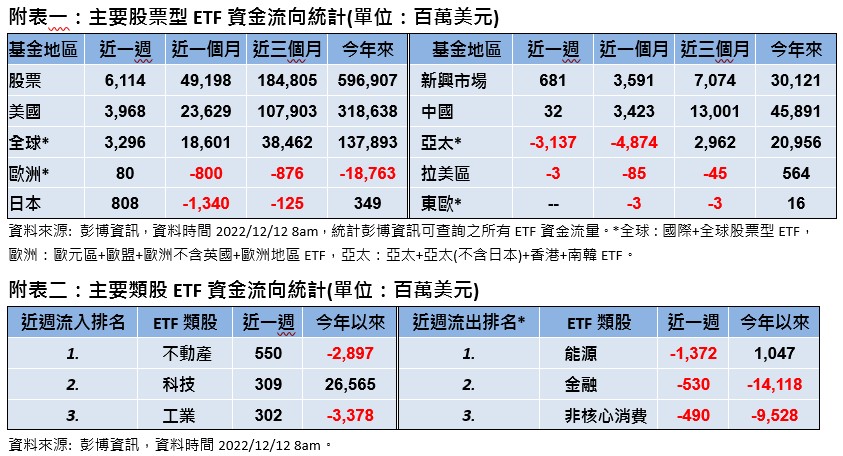 過去一週升息及經濟衰退擔憂壓抑美股,然而中港股市受惠於中國優化防疫措施而續強,市場靜待未來一週的歐美超級央行週,資金面期待能有放緩升息幅度的利多,多數股市ETF資金為淨流入,債市也普遍持續吸金。累積MSCI全球股市指數週線下跌2.21%、新興股市上漲0.48%,其中香港國企股指數週線大漲7.31%領先,上證指數亦收高1.61%(彭博資訊,截至12/9)。