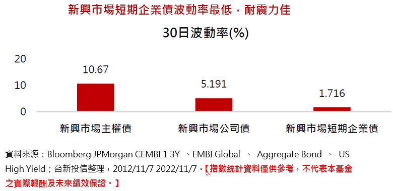台新投信表示,新興市場企業債已今非昔比,新興市場企業受惠於其日益成熟的國內金融市場,目前正減少對外國資本來源的依賴;也就是說,資本支出與投資項目受到全球金融市場的影響也逐漸降低,體質比過往更加穩定;另一方面,新興短期企業債目前殖利率高達8%以上,與美債殖利率相比,仍具吸引力,加上短天期對利率敏感度較低優勢,新興市場短期企業債波動度僅約1.7%,明顯低於新興市場主權債的波動度逾10%,以及新興市場公司債的波動度約5%,可望成為現今高波動環境下的絕資金佳避風港。