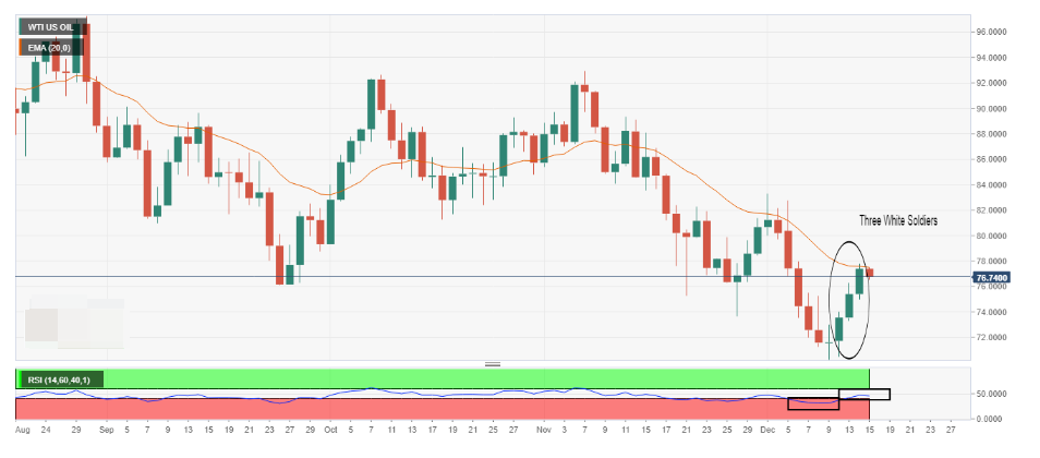 WTI油價刷新11個月低點後錄得白三兵蠟燭線形態觸發了看漲反轉,油價目前在20EMA均線77.50美元附近遇阻