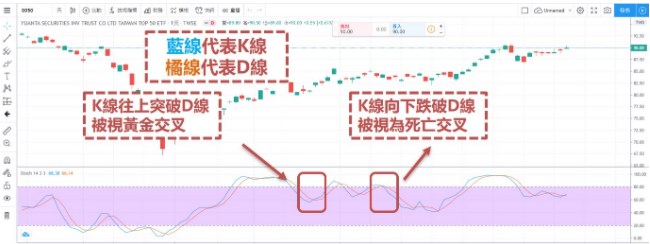 當K值從高檔往下跌破D值時,被視為死亡交叉,一般認為短期可能有機會轉折從高檔向下跌。