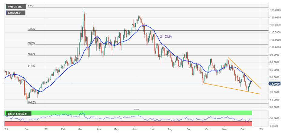 油價最新跌勢也可能與未能突破21日MA均線77.00美元有關。鑒於相對強弱指標看跌,油價可能面臨進一步拋售壓力。