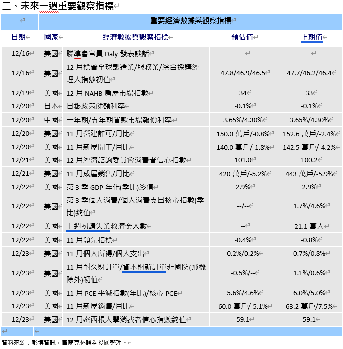 · 經濟數據:11月PCE通膨率、個人所得/支出、領先指標、房市數據包括營建許可、新屋開工、成屋及新屋銷售,12月消費者信心指數。