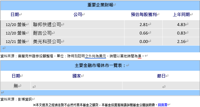 · 企業財報: 聯邦快遞、Nike及美光科技公布財報。