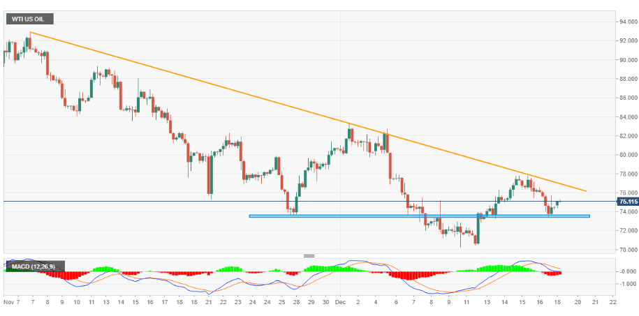 12月19日週一亞市早盤,WTI油價繼經歷兩日上漲趨勢後,反彈受阻,目前交投於74.60美元/桶附近。雖然市場押注於中國經濟重新開放可望帶動需求復蘇,同時拜登政府開始補充戰略儲備也提振了油價前景。但此前美聯儲和歐洲幾家央行就加息發表鷹派言論,引發人們對可能出現經濟衰退的擔憂,而且下行趨勢線對油價壓制比較明顯,需要提防油價的進一步下探風險。