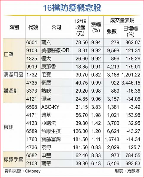 市場擔憂景氣不確定性,美股續黑,台股19日表現也仍疲弱,資金從電子股撤出,轉入生技類股停泊,其中,防疫概念股挾大陸解禁題材,特別受到青睞,如口罩股南六(6504)、體溫計的豪展(4735)等爆量衝漲停,16檔相關類股冒出頭,重演疫情爆發之初的多方行情。