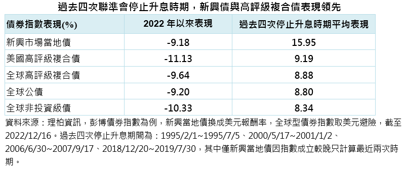 統計過去四次聯準會停止升息時期,以新興市場當地債與高評級複合債表現領先(詳見附表,取彭博債券指數為例)。富蘭克林證券投顧表示,展望2023年通膨放緩、聯準會升息接近尾聲及景氣下行風險,將開啟債市轉多行情,建議投資人依照個人風險屬性增持適合的債券型基金,首選側重高評級債的美元全球複合債型基金。