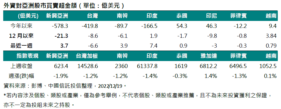 美國聯準會上週召開利率會議,如市場預期升息2碼,但官員的鷹派言論以及市場對經濟衰退的擔憂致美股疲弱,新興亞股除印尼、越南分別上漲1.4%及0.1%之外,其餘新興國家市場均呈現走跌的情況,印度、菲律賓分別下跌1.4%與1.3%,台股及南韓均下跌1.2%;綜觀上週資金動向,印度、南韓分別淨流入7.4億美元與3.9億美元,而台灣慘遭外資提款6.6億美元,成新興國家失血最多的國家。