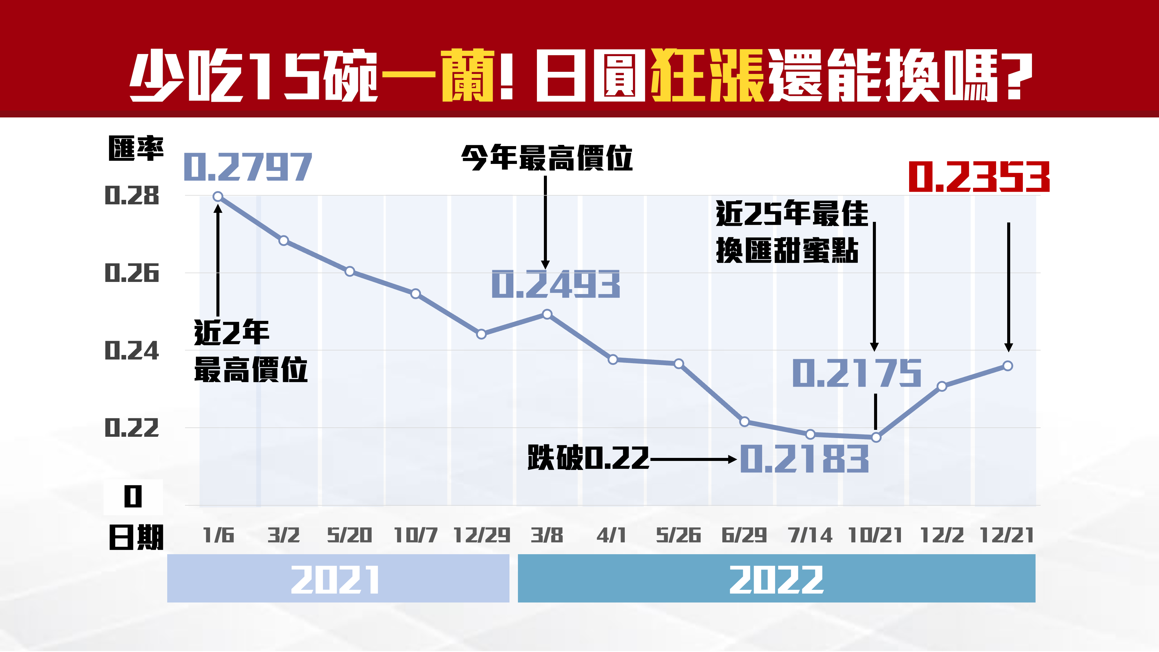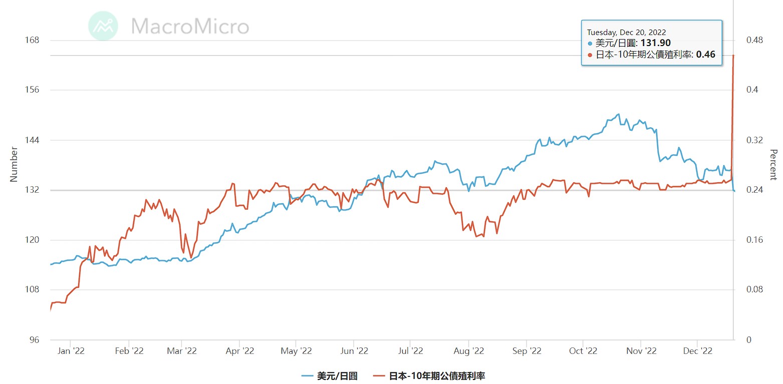 2022/12/20日本央行總裁黑田東彥日調整殖利率曲線控制 (YCC) 計畫,將10年期日本國債收益率上升至0.5%,之前日圓兌美元137.16;但在此決策後,日圓漲幅逾2.7%,日圓兌美元133.15。2022/12/23台銀牌告匯率顯示,截至下午3點為止最高價來到0.2353元,創7個月新高,與2022年10月「最佳換匯」低點0.2175相較,2022年12月用10萬台幣少換近3.5萬日圓。此政策震撼彈,更導致亞股通殺,日股一度暴跌819點,跌幅逾3%;台股也跳水大跌,加權指數一路從14400點殺至盤中最低14157點,港股、陸股下跌幅度都超過1%。