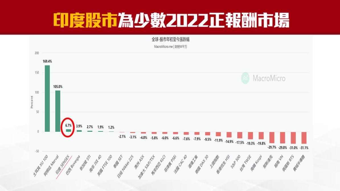 2022印度市場成為全球少數亮點,因為經濟成長和資金持續流入,印度2022年上半年受惠於俄羅斯低價石油價差,賺取歐洲大量石油暴力財;而來到2022年下半年有中國+1的題材發酵,部分歐美大廠開始移轉生產重心進入印度,因此短期來說印度仍處於正成長階段。然以投資角度來說印度市場相對2022年基期最高,所以不建議在2022年底貿然投入此市場,應該等待下一次印度回檔時再切入。興哥退休人生