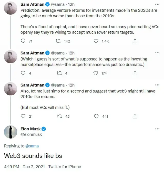 馬斯克上週在推特上回覆美國創業孵化器Y Combinator總裁Sam Altman稱——"Web3聽起來像是胡說八道。 ”