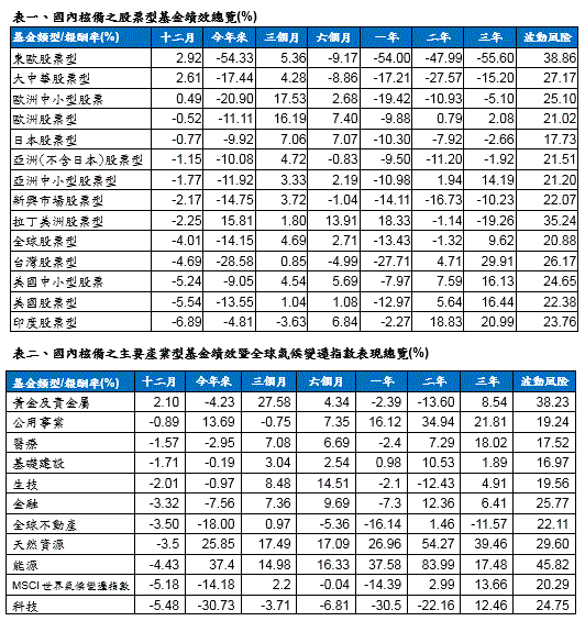 儘管主要國家通膨出現降溫跡象,但聯準會、歐洲央行、英國央行仍維持鷹派基調,日本央行也意外調整殖利率曲線控制(YCC)計畫,讓投資人擔憂央行的行動可能觸發經濟衰退,連帶拖累股市回落,但債券在經濟衰退擔憂下受到資金追捧。總計12月以來台灣金管會證期局核備的988檔境外基金(股、債均含)平均下跌1.47%,其中,714檔股票型基金平均下跌2.25%,257檔債券型基金平均上漲0.56%(理柏資訊,台幣計價至12/26)。