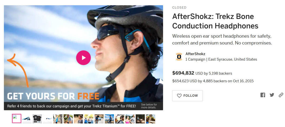 直到2015年,打磨多年技術的韶音在indiegogo上發起了一場眾籌。眾籌產品Trekz系列摒棄了此前使用的高彈性塑膠,轉用全鈦材料,重量較上代產品減重40%,做到了30g。同時還集成了韶音業已成熟的技術,例如藍牙、擴頻、降漏音和防水等等,最終為其籌得了近70萬美金。