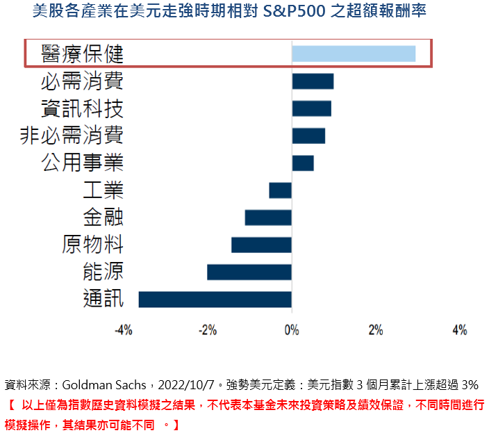 台新醫療保健新趨勢基金經理人黃俊晏表示,Fed持續快速升息及縮表,使資金回流美國,在美國經濟續穩,與各主要國家利差擴大下,美元指數今年一路走強。過去10年以來,觀察美元走升與美股標普各產業表現,醫療保健產業為美元走強時期表現最佳的產業,主要原因為醫療產業海外營收占比僅17%,在美元走升時期相對具有優勢。雖然近期放緩升息步調的期望,促使美元漲勢受到打壓,但預期未來多半是維持高檔震盪格局,建議美股投資可以強勢美元下的優勢產業「醫療保健」為首選。