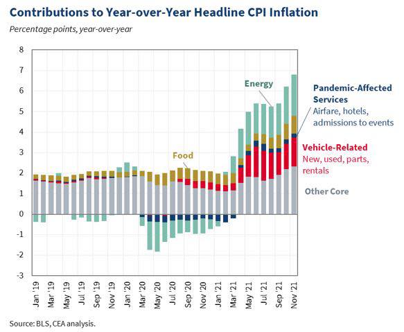 根據MarketWatch.com的報導,能源貢獻了30%、汽車 20%、住房 18%、食物 13%,為四大主要通膨來源,能源主要來自高漲的油價,汽車則有缺晶片、供應鏈問題,住房則因資金氾濫、在家工作等因素。