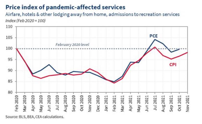 食物的部分很大部分是來自能源價格、工資的上漲導致上漲,而疫情受害的航空、旅遊、住宿費用,其實才勉強回到疫情前水準,並無上漲狀況,顯示並非萬物齊漲的狀態。