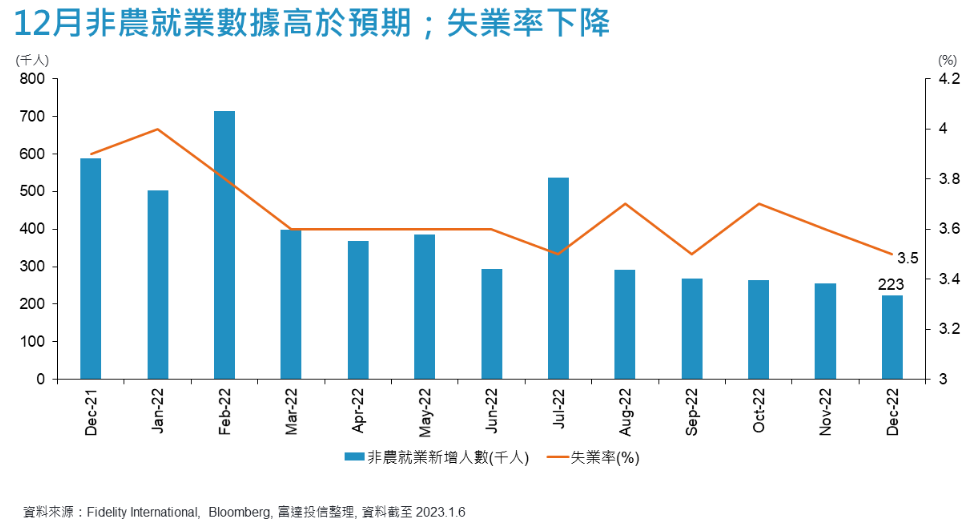 強勁的就業數據帶動下,股市與債市皆呈現上漲。非農就業數據顯示美國勞動市場仍然緊俏,惟12 月平均時薪成長年增率自4.8%降為 4.6%,低於預期的 5.0%,期貨市場因而樂觀預期聯準會2月份有望將升息幅度由2碼降為1碼,甚至下半年有機會降息。然而聯準會12月的利率會議記錄顯示官員持續對抗通膨的決心,擔心過早放鬆貨幣政策恐帶來通膨的上行風險,顯示美國聯準會可能維持較高利率水準一段時間。接下來觀察重點為經濟是否會溫和放緩與企業獲利是否會同步調整,在此總經背景下,仍需保持相當的防禦性。
