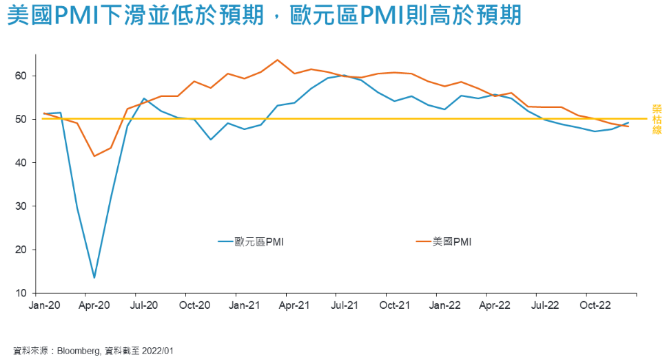 美國12月ISM製造業PMI降至48.4,已連續2個月下滑。顯示未來需求疲弱,加上利率上揚與經濟活動放緩等都對工廠製造活動形成壓力;歐元區12月綜合PMI則高於預期的48.8,達49.3,顯示歐元區的經濟衰退幅度較預期緩和。中國財新製造業PMI降至49,儘管清零政策已告結束,但由於短期內感染人數的激增,生產活動持續受到衝擊,企業壓力倍增。加上外部總體需求疲弱,使中國財新製造業PMI指數持續低迷。