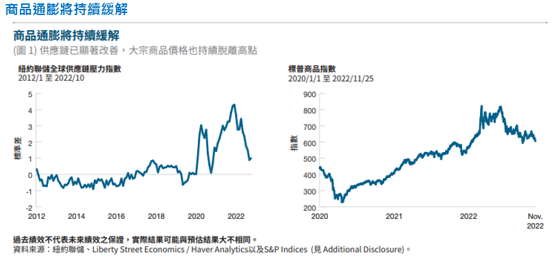 從 2022 年初以來包括食物、能源、及其他大宗商品的價格已持續下滑,去年 4 月之後供應鏈壓力緩解亦有助於減輕價格壓力,且依前瞻性指標來看,價格下降的趨勢將持續下去 (圖 1)。