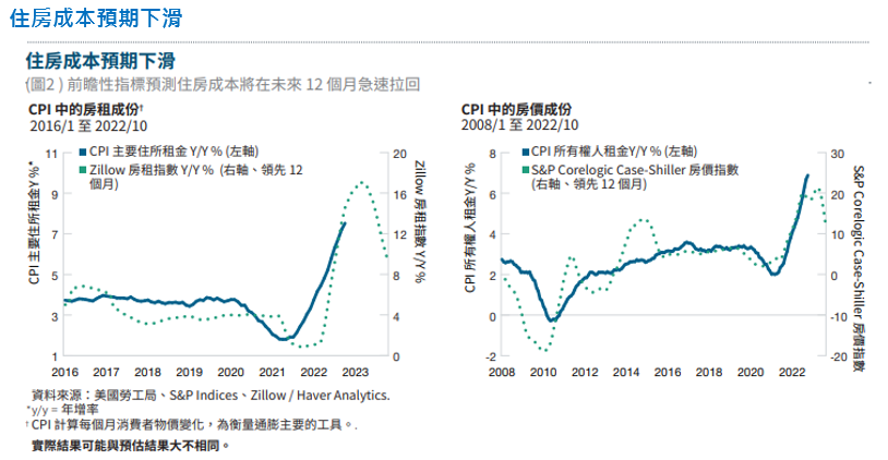 整體而言,商品及服務業通膨在 2023 年中之前有機會見到相當程度的下滑,於是可以合理預期聯準會將放慢升息步調或暫緩升息,然而我們認為若工資成本持續上升,且通膨維持在聯準會的 2% 目標以上,則降息機會不大。