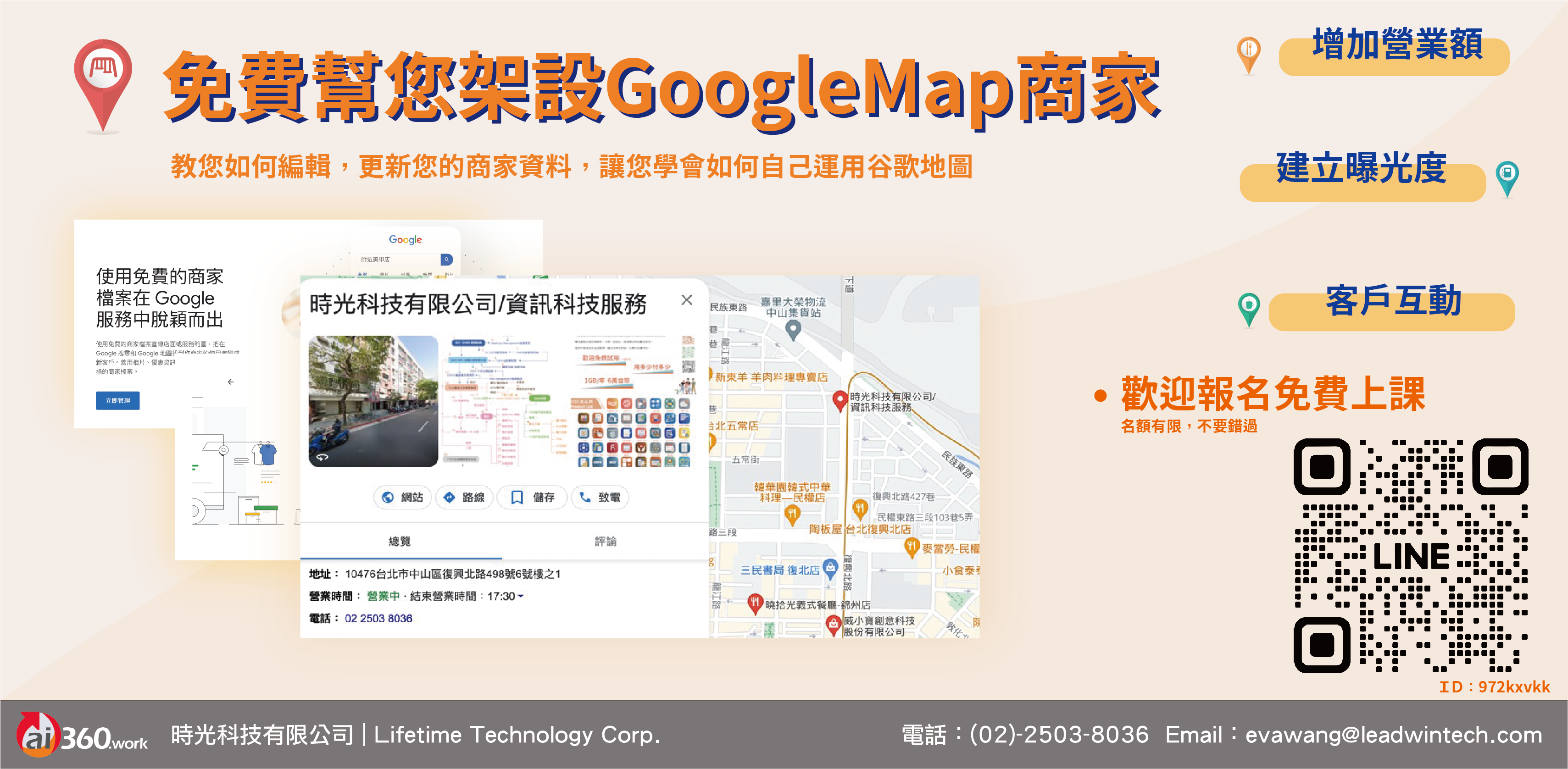 更進一步教您如何編輯,更新您的商家資料,讓您學會如何自己運用谷歌地圖,建立曝光度, 與客戶互動,增加營業額。歡迎來電報名免費上課。